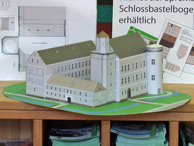 | Das Spremberger Schloß ist jetzt als Papierbastelbogen erschienen. Auf 3 Blättern im A3 Format sind die Gebäude dargestellt. Ein viertes Blatt zeigt die Draufsicht und dient als Montagefläche. Auf kleine Details wurde verzichtet. Bei Frau Schröder in der Friedrichstraße, im Spielwarengeschäft in der Karl-Marx Straße und in Krätzschmars Buchhandlung ist er bereits erhältlich.