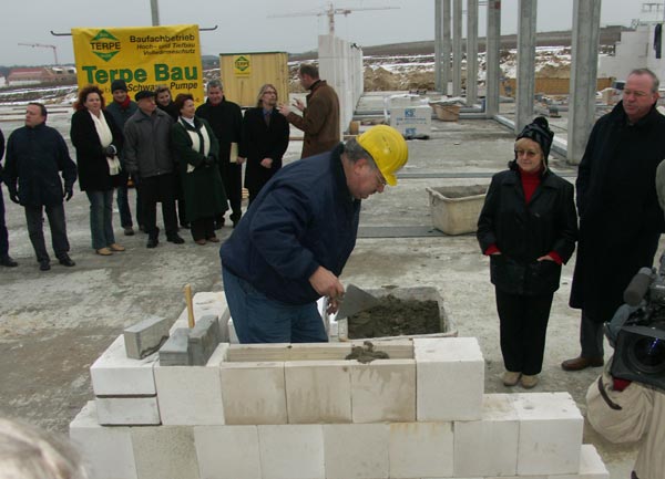 | Firmenchef Werner Schiemenz von Terpe Bau bereitet persönlich die Grundsteinlegung vor. Seine Firma erhielt neben Los 1 im Mietwohnungsbau auch den Zuschlag für Schule und Turnhalle. Etwa 60 Mann seiner 80 köpfigen Belegschaft sind hier vor Ort tätig. |